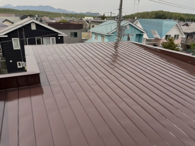 屋根各所コーキングの上で高圧洗浄水洗い→下塗り(防錆プライマー)1回塗り→上塗り(2液性シリコン)1回塗りにて塗装いたしました。また、ベランダすのこ板も撤去・塗装作業後に復旧いたしました。